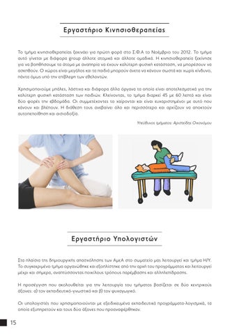 Εργαστήριο Κινησιοθεραπείας Το τμήμα κινησιοθεραπείας ξεκινάει για πρώτη φορά στο Σ.Φ.Α το Νοέμβριο του 2012. Το τμήμα αυτό γίνεται με διάφορα group άλλοτε ατομικά και άλλοτε ομαδικά. Η κινησιοθεραπεία ξεκίνησε για να βοηθήσουμε τα άτομα με αναπηρία να έχουν καλύτερη φυσική κατάσταση, να μπορέσουν να ασκηθούν. Ο χώρος είναι μεγάλος και τα παιδιά μπορούν άνετα να κάνουν σωστά και χωρίς κίνδυνο, πάντα όμως υπό την επίβλεψη των εθελοντών. Χρησιμοποιούμε μπάλες, λάστιχα και διάφορα άλλα όργανα τα οποία είναι αποτελεσματικά για την καλύτερη φυσική κατάσταση των παιδιών. Κλείνοντας, το τμήμα διαρκεί 45 με 60 λεπτά και είναι δύο φορές την εβδομάδα. Οι συμμετέχοντες το χαίρονται και είναι ευχαριστημένοι με αυτό που κάνουν και βλέπουν. Η διάθεση τους ανεβαίνει όλο και περισσότερο και αρχίζουν να αποκτούν αυτοπεποίθηση και αισιοδοξία. Υπεύθυνος τμήματος: Αριστείδης Οικονόμου