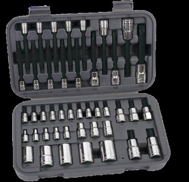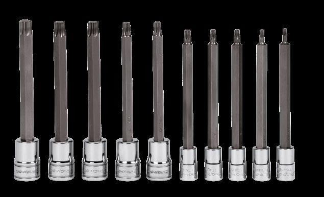 • 3/8" drive components include: (4) External TORX® Sockets (E10–E16); (3) Tamper-Resistant TORX® Bit Sockets (T40, T45 and T50) and (3) Tamper-Resistant TORX® Long Bit Sockets (T40, T45 and T50)