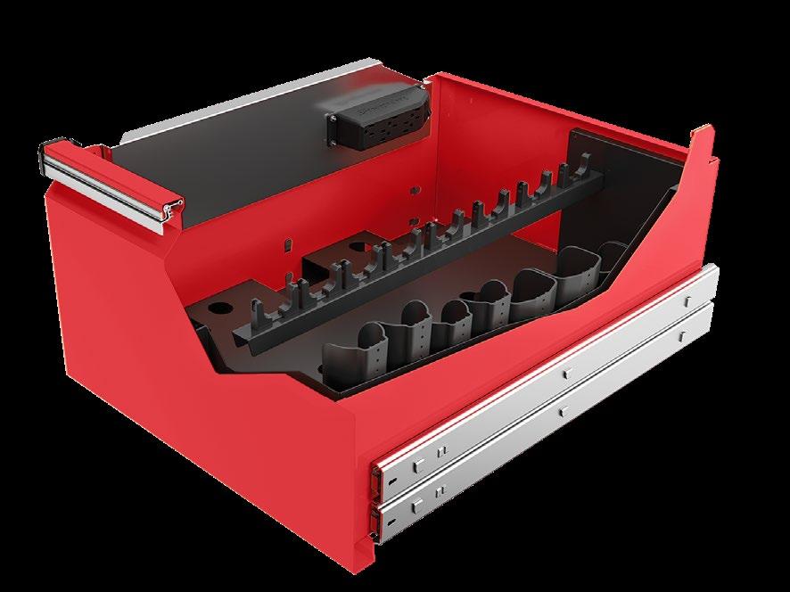PowerDrawer: Dedicated drawer for organization of power tools and charging — power strip includes 5 outlets and 2 USBs. Plug in, Lock up & Power on!