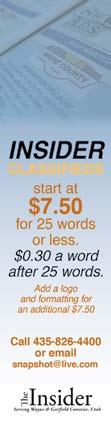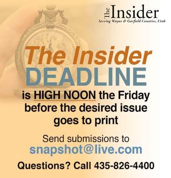 Publisher: Erica Walz Layout & Graphic Design: Emily Leach Reporter: Tessa Barkan Reporter: Amiee Maxwell Reporter: Kadi Franson Reporter: Lisa Jeppson Payroll: Trudy Stowe Local columnists: Mack Oetting - FYI Panguitch The Insider is a weekly community newspaper delivered each Thursday to households in Wayne and Garfield counties, Utah. The entire contents of this newspaper are © 2022 The Insider/Snapshot Multimedia, LLC. The Insider reserves the right to edit or reject any advertisement or submitted content items. Articles submitted by independent writers may or may not be the opinion of The Insider. Please feel free to contact us for advertising rates and with any questions regarding content submissions. We prefer content and ads submitted by email to snapshot@live.com but we will accept your information any way you can get it to us. Subscriptions to The Insider are available outside of Wayne and Garfield counties for $35 for 26 weeks, $60 per year. Content and ad deadline: Friday at Noon Have a news tip or story idea? Email us at snapshot@live.com or call us at 435-826-4400 P.O. Box 105 Escalante, UT 84726 435-826-4400 email snapshot@live.com TheInsider Page 2 The Insider January 5, 2023