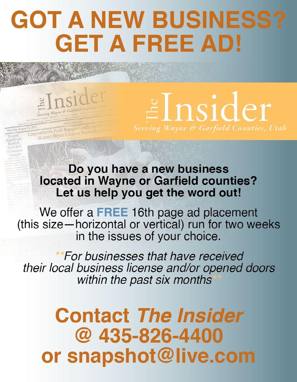 Publisher: Erica Walz Layout & Graphic Design: Emily Leach Reporter: Tessa Barkan Reporter: Amiee Maxwell Reporter: Kadi Franson Reporter: Ian Marynowski Reporter: Jaynie Connor Reporter: Nancy Goude Payroll: Trudy Stowe Local columnists: Mack Oetting - FYI Panguitch The Insider is a weekly community newspaper delivered each Thursday to households in Wayne and Garfield counties, Utah. The entire contents of this newspaper are © 2023 The Wayne & Garfield County Insider, LLC/ Corner Post Media The Insider reserves the right to edit or reject any advertisement or submitted content items. Articles submitted by independent writers may or may not be the opinion of The Insider. Please feel free to contact us for advertising rates and with any questions regarding content submissions. We prefer content and ads submitted by email to snapshot@live.com but we will accept your information any way you can get it to us. Subscriptions to The Insider are available outside of Wayne and Garfield counties for $40 for 26 weeks, $70 per year. Content and ad deadline: Friday at Noon Have a news tip or story idea? Email us at snapshot@live.com or call us at 435-826-4400 P.O. Box 105 Escalante, UT 84726 435-826-4400 email snapshot@live.com TheInsider A2 The Insider March 21, 2024