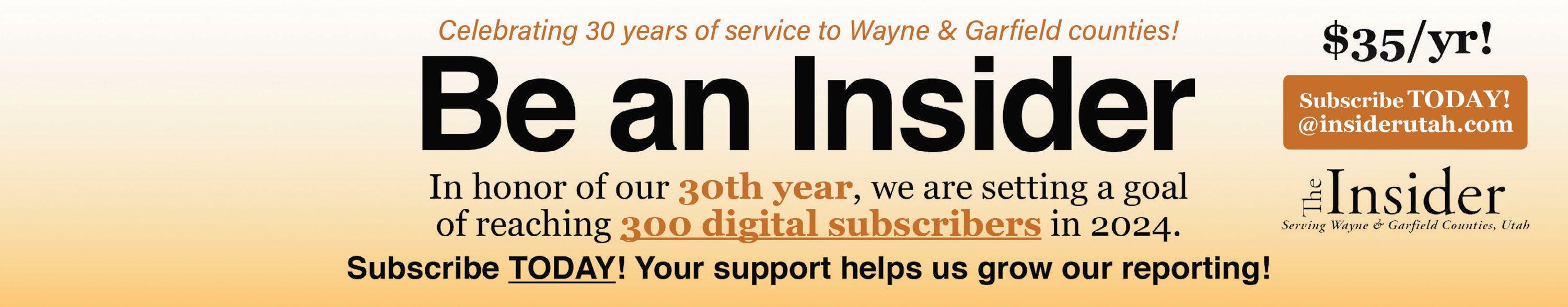 This means we have a ways to go to reach our goal. Digital subscriptions are just $35 per year, and with that you get something new! Our weekly email newsletter and full access to content on our Web site, insiderutah.com. Will you be among our new subscribers this week? Our goal is 5 for this week. That could be you!