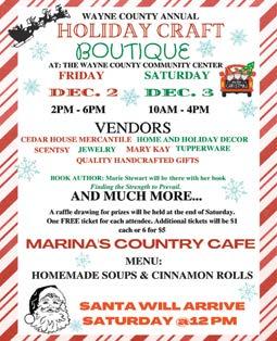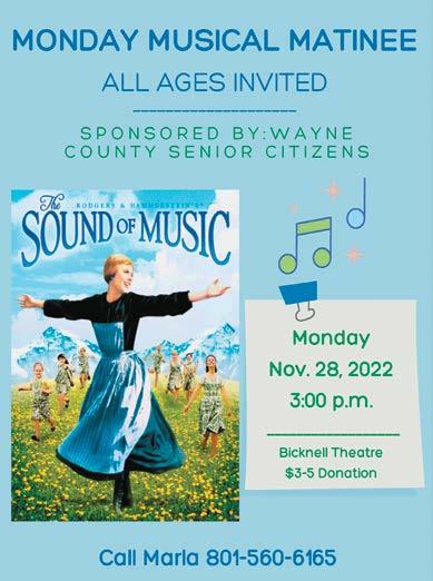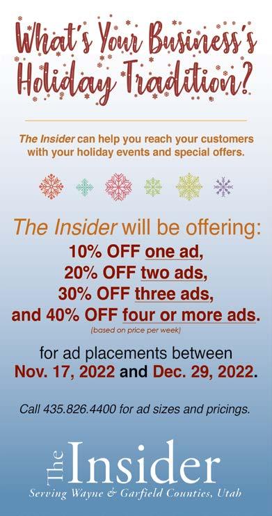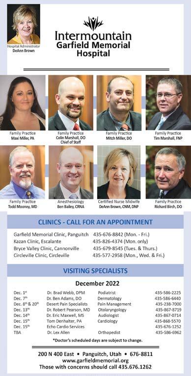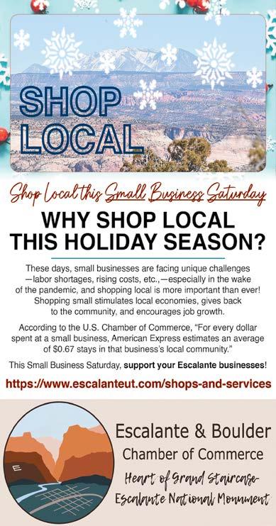 Utah Loa • Fremont • Lyman • Bicknell • Teasdale • Torrey • Grover • Fruita • Caineville • Hanksville Panguitch • Panguitch Lake • Hatch • Antimony • Bryce • Tropic • Henrieville • Cannonville • Escalante • Boulder Help us reach our goal of 200 digital subscribers in 2022! see page 7 for details... UPCOMING EVENTS... Wayne County Annual Holiday Craft Boutique Dec. 2 & 3, 2022 Wayne County Community Center 2022 Boulder