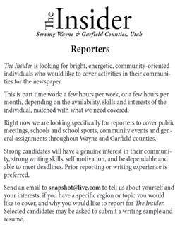 BOXHOLDER ALL content for THE WAYNE & GARFIELD COUNTY INSIDER MUST BE submitted by FRIDAY AT NOON to be included in the following Thursday edition of the paper. PRE-SORT STANDARD PAID RICHFIELD, UTAH PERMIT No. 122