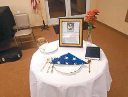 round to show our everlast ing concern for our missing soldier; the tablecloth is white, symbolizing the purity of their motives when they answered the call of duty; the single red rose is a reminder of their lives; A slice of lemon on the bread plate is to remind us of the bitter fate of those cap tured and missing on foreign soil; a pinch of salt symbolizes the tears shed by all; the Bible represents the strength gained through faith and our country which was founded as “One Nation Under God;” the glass is inverted to symbolize the in ability to share a toast with us; the candle represents the light of hope, which lives in our