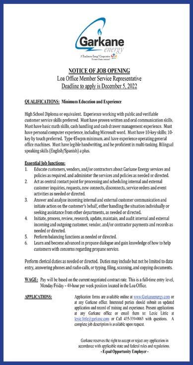 Applications can be obtained from the Wayne County Clerk's Office, 18 South Main, Loa, UT 84747, or by calling 435-836-1300 and requesting one to be sent to you. Applica tions will be accepted until 5:00 p.m. on Friday, December 9, 2022. Please include cover letter and resume, including references, with the application. Please call the Clerk's Office with any questions.