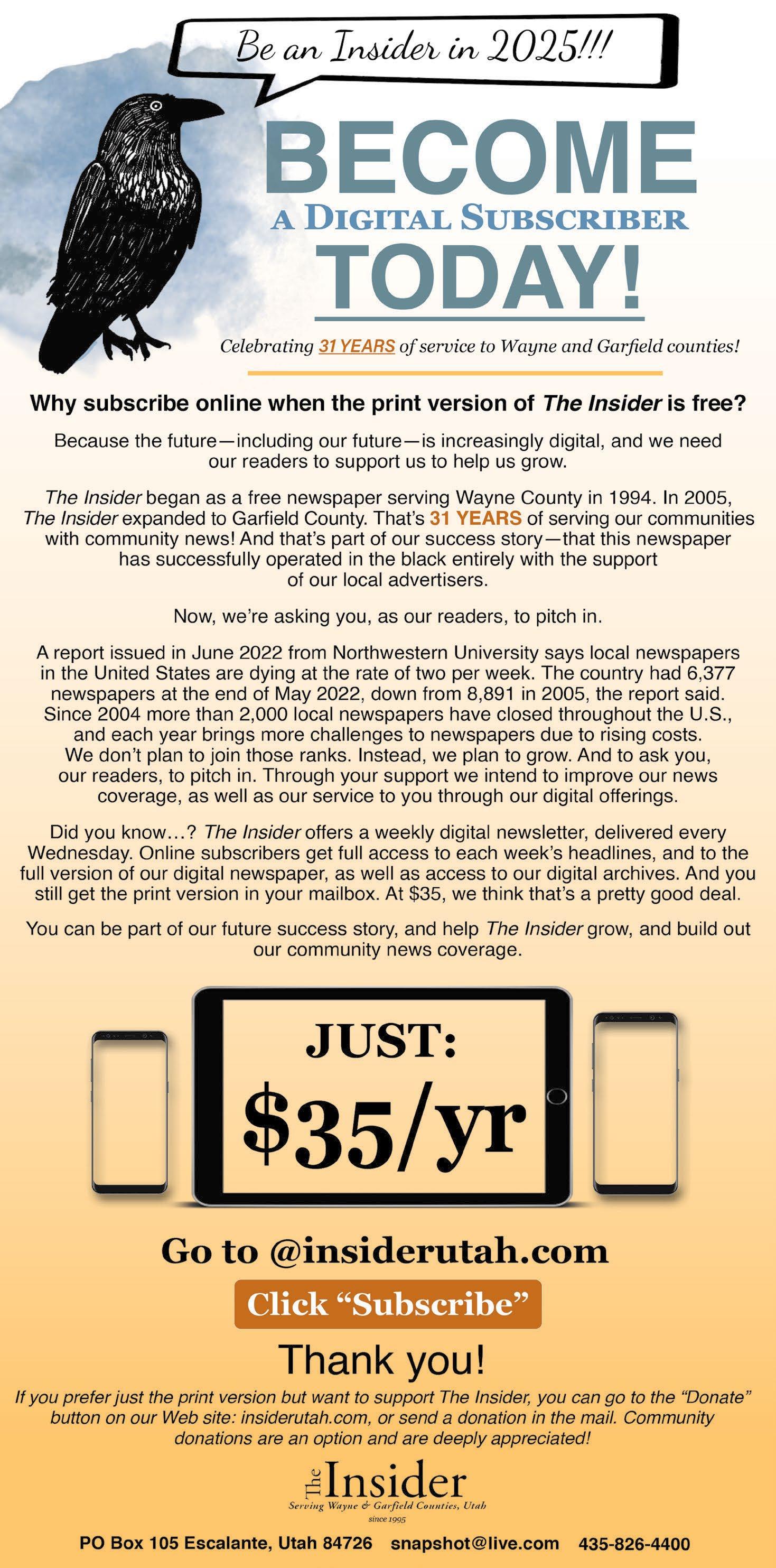 Please feel free to contact us for advertising rates and with any questions regarding content submissions. We prefer content and ads submitted by email to snapshot@live.com but we will accept your information any way you can get it to us. Subscriptions to The Insider are available outside of Wayne and Garfield counties for $40 for 26 weeks, $70 per year. Content and ad deadline: Friday at Noon Have a news tip or story idea? Email us at snapshot@live.com or call us at 435-826-4400 P.O. Box 105 Escalante, UT 84726 435-826-4400 email snapshot@live.com
