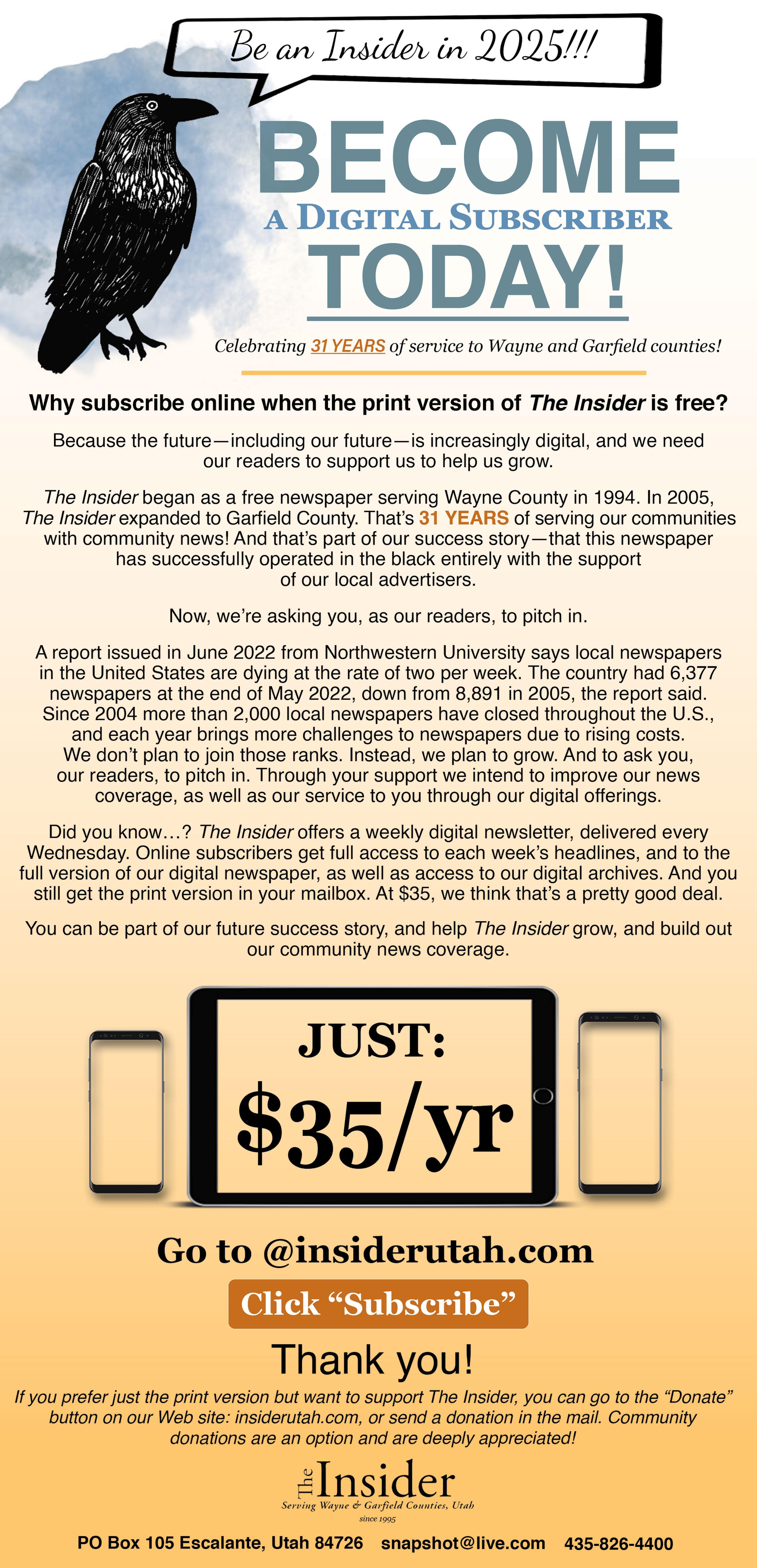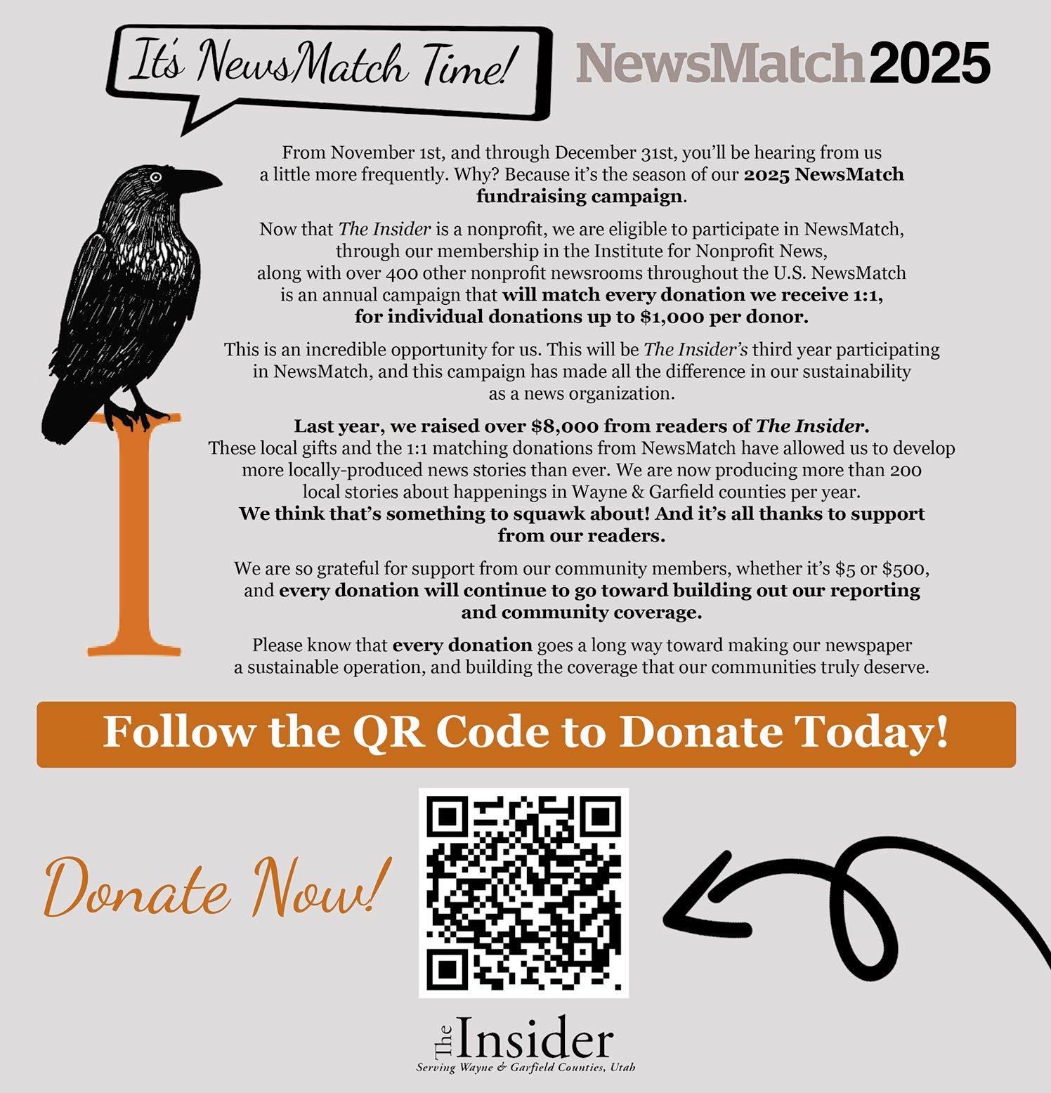 means of keeping media services viable throughout the country. We feel we’ve been smart in terms of providing for the sustainability of independent media serving our region by going nonprofit. But this means we are counting on you. Some very good news is that our NewsMatch campaign so far is going well. We’ve raised over $14,000 to date but currently need to raise approximately $4,000 by December 31, 2025 to meet the full $18,000 matching grant provided by NewsMatch. A number of you have supported The Insider with $1,000 gifts representing the highest individual donor match amount. We are so grateful for this support! Most of you can only give a much more modest donation, and many of you have helped with $10, $25, $50 donations, and these are very helpful. If we meet our fundraising goal (or even a stretch goal), it will mean at least $36,000 in funding for Corner Post Media. This goes a long way with us and will help us increase our local reporting. In this past year, due to the additional resources provided by reader support during our previous NewsMatch campaigns, we’ve produced over 200 original local stories, and your support will help us do more! You can donate to The Insider through our website at insiderutah. com, or donations can be sent to The Insider, P.O. Box 105, Escalante, UT 84726. And your donation received by Dec. 31 will doubled!