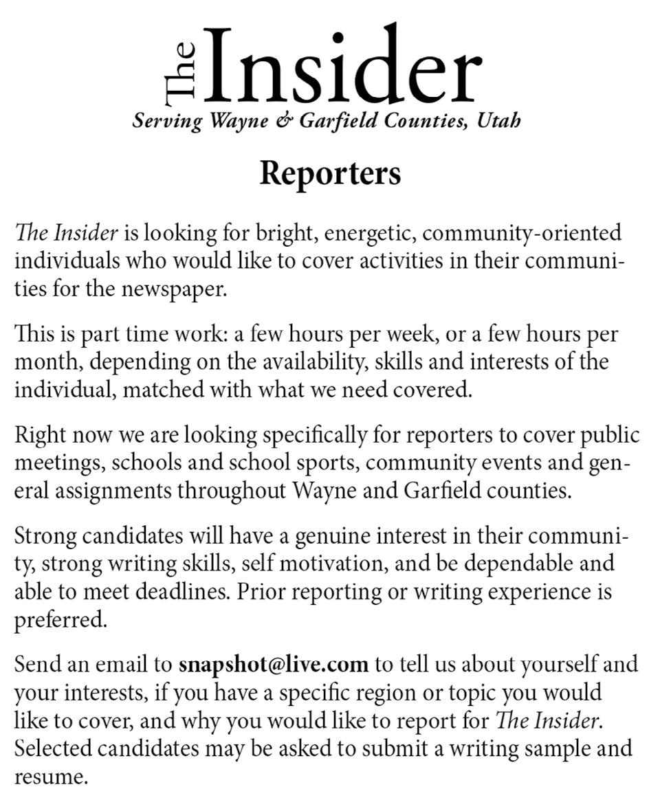 The Insider, Corner Post Media, P.O. Box 105, Escalante, UT 84726 snapshot@live.com 435-826-4400 insiderutah.com