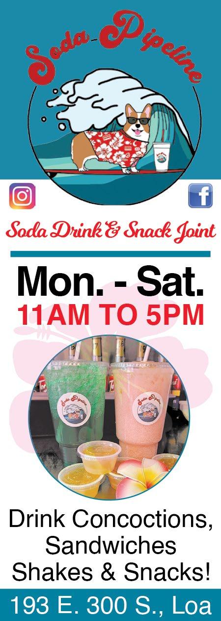 Soda Pipeline: The Soda Pipeline in Loa celebrated its second anniversary on May 13, 2025.They offered free chocolate chip cookies and double punches for loyalty card holders that day. Mark Elmer, who owns the soda shop with his wife, Annette, wanted to “thank the community for supporting us.”