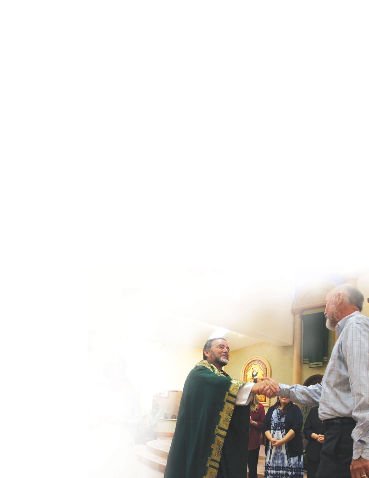 (Right) Fr. Paul hruby, pastor of St. Julie Billiart Parish in Newbury Park, congratulates Tom Ryan, one of the pioneer care-givers through Stephen Ministry, co-sponsored by the Sisters of Notre Dame and St. Julie’s.
