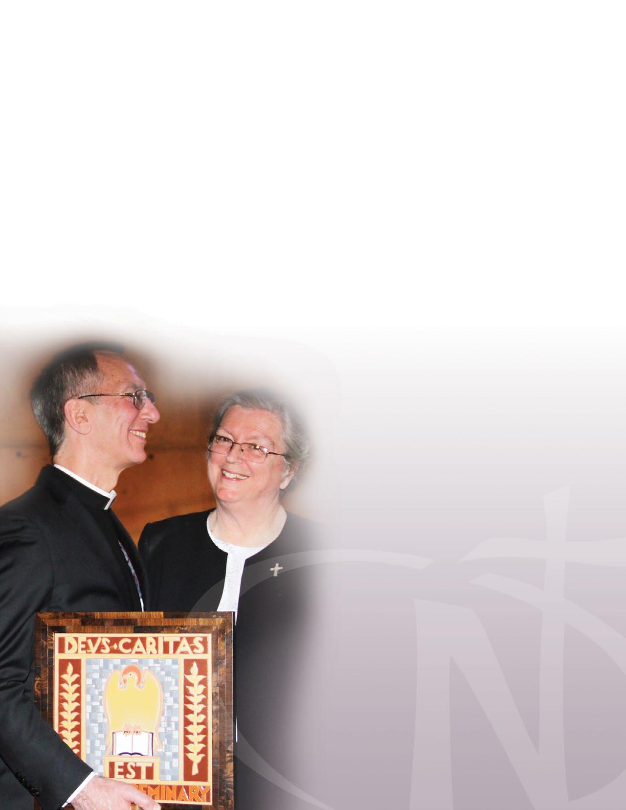 (Left) Msgr. Marc Trudeau, rector of St. John’s Seminary in Camarillo, presents the Distinguished Alumni Award to Sr. M. Anncarla Costello.