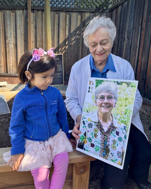 Sister Yvonne Bondi, SNDdeN sits with Ivy, a Notre Dame Preschool student, by the tree planted in memory of Sister Dorothy Stang, SNDdeN, martyred 20 years ago for her courageous environmental justice work in Brazil.