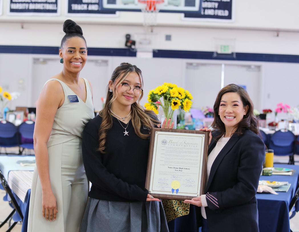 above (top to bottom ): NDSJ students. Santa Clara County Supervisor, Betty Duong, presents commendation to NDSJ Head of School, Ashley Rae Mathis, and a student. Sister Maureen Hilliard, SNDdeN speaks at 30th anniversary celebration.