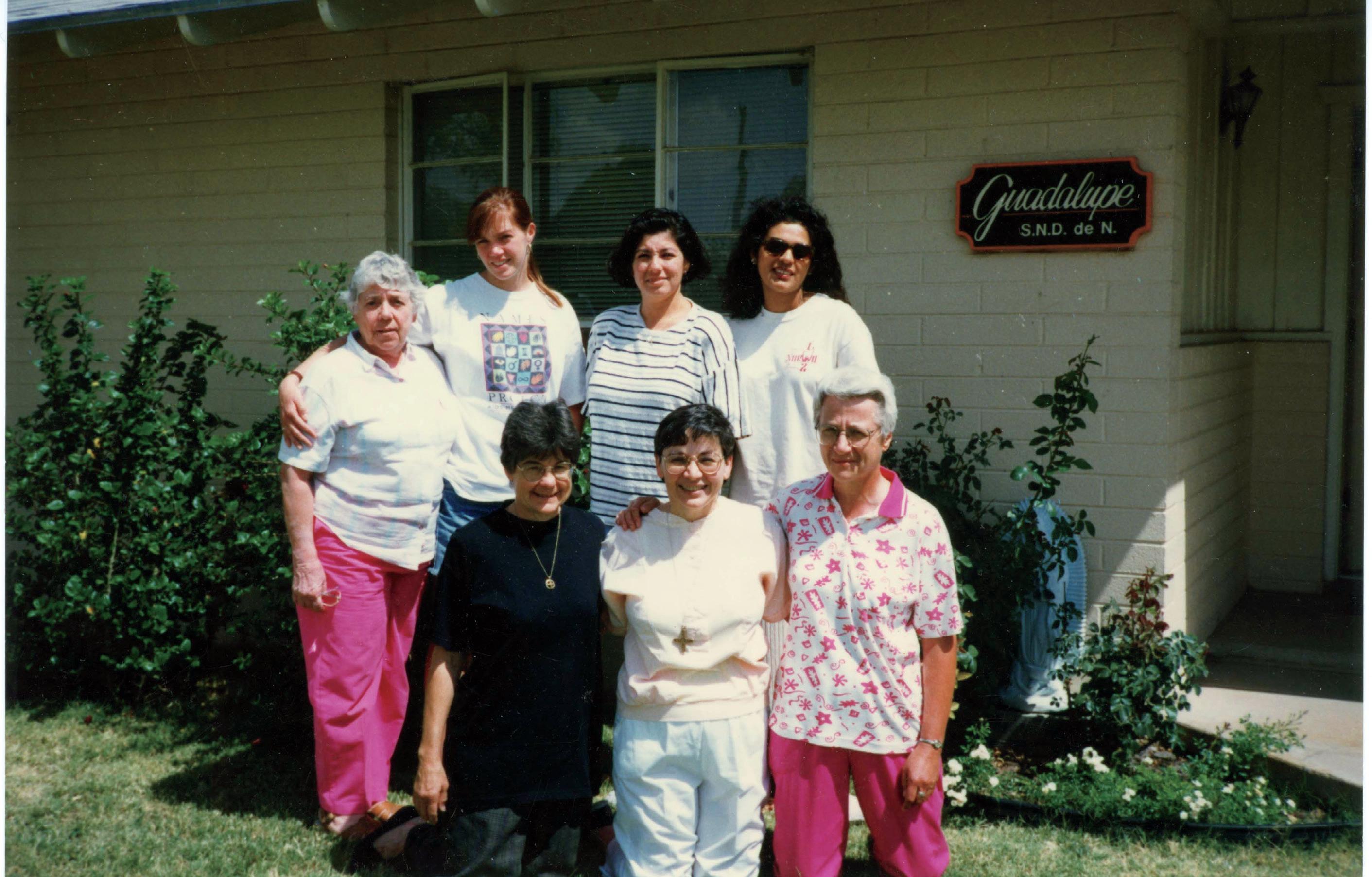 In the 1990s, friends of Sisters of Notre Dame de Namur (back row) visited the Guadalupe House in Mesa, Arizona. Front row, left to right: Sisters of Notre Dame de Namur Pat Pieper, Geri Bolzan and Dolores Lintner.