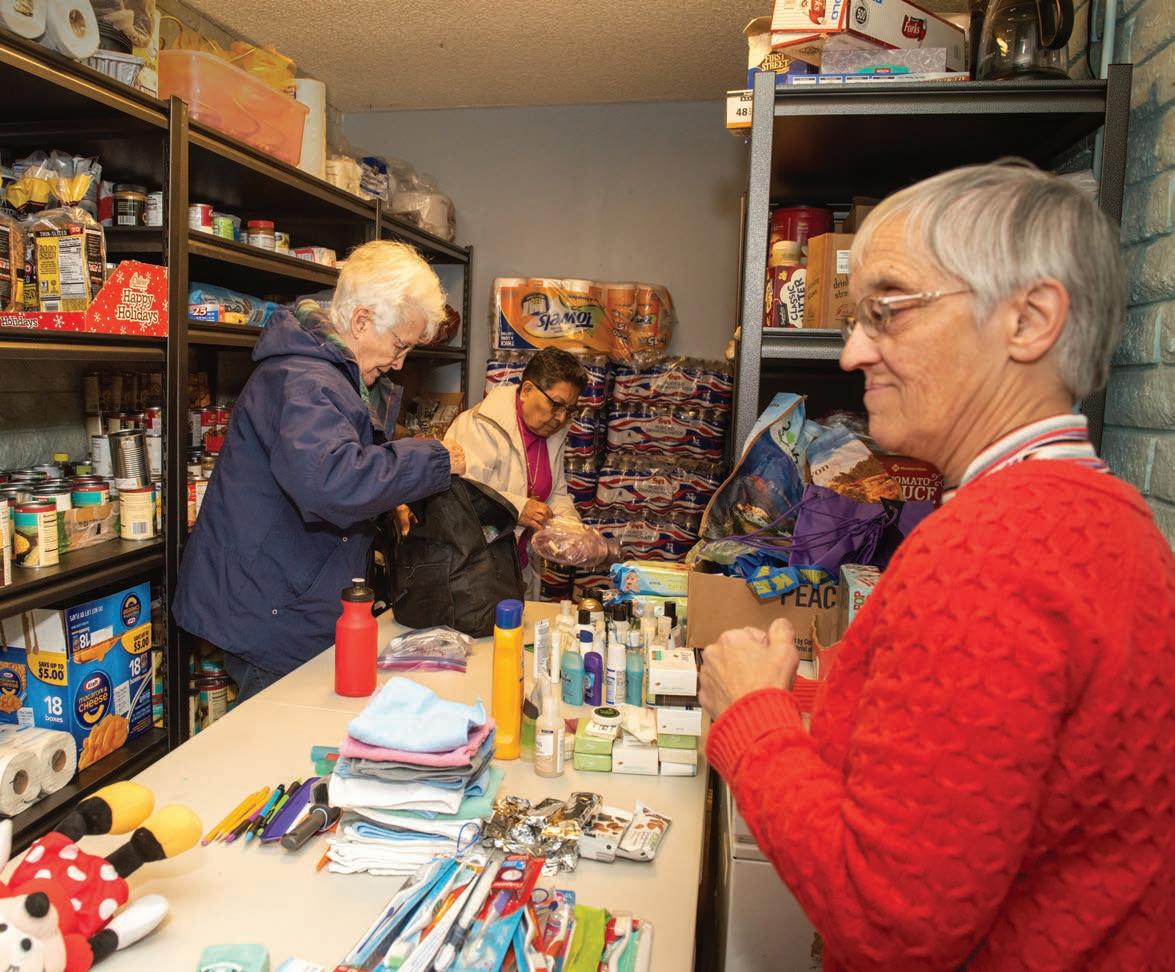 Sisters Jo Anne Depweg, Maria Olivia Pacheco and Liane Delsuc fill backpacks with essentials like food and toiletries for immigrant families to take on the road.