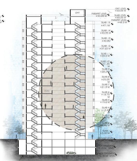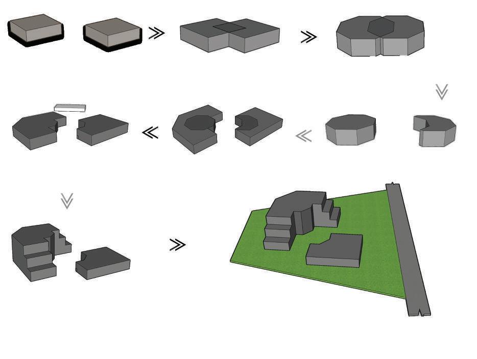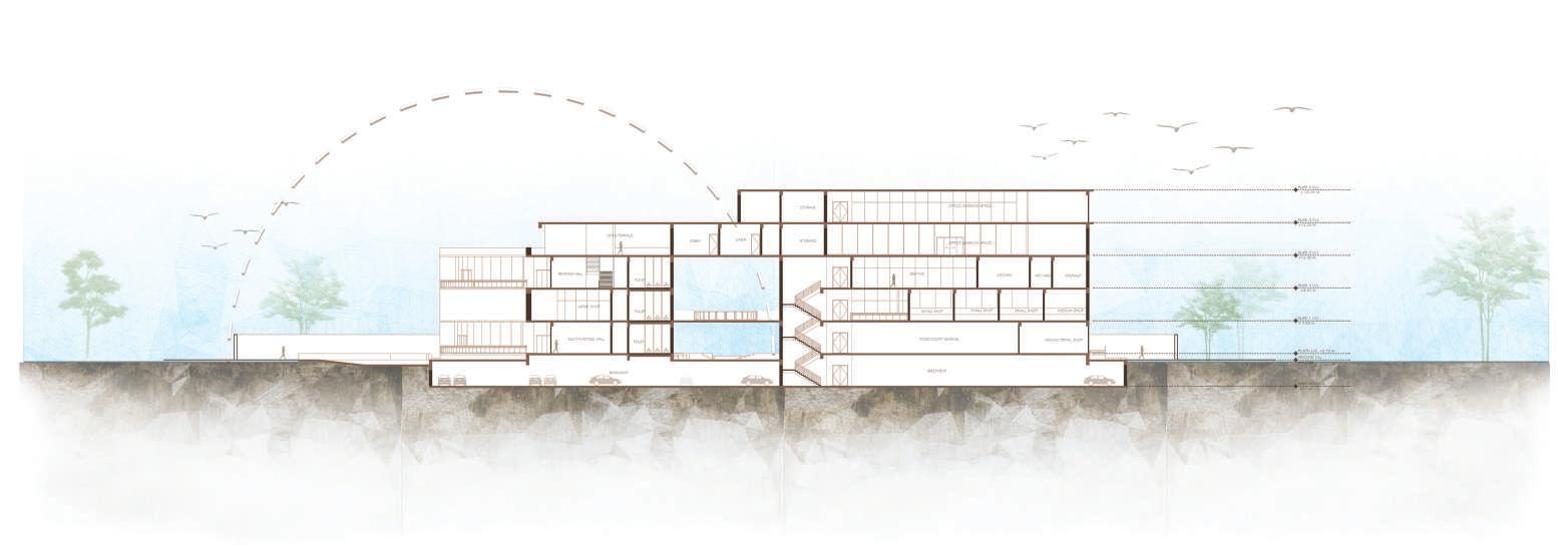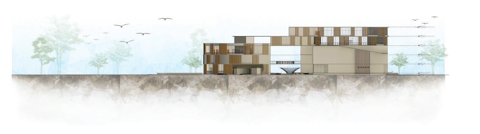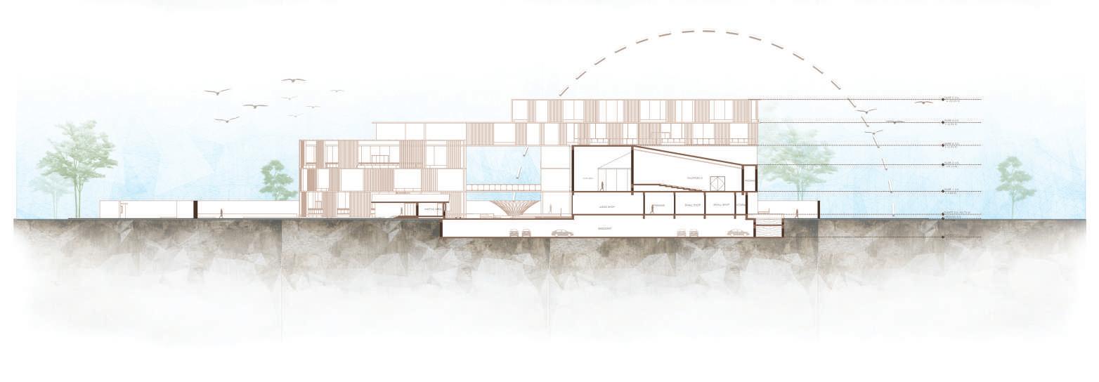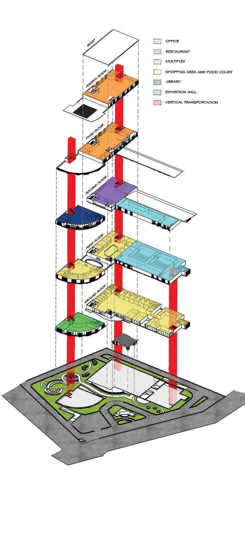 The unifying concept for this L-shaped building is “Vertical Integration.” This concept emphasizes the seamless integration of diverse functions vertically within the building, creating a cohesive experience for users while maintaining visual and functional connections between different levels.