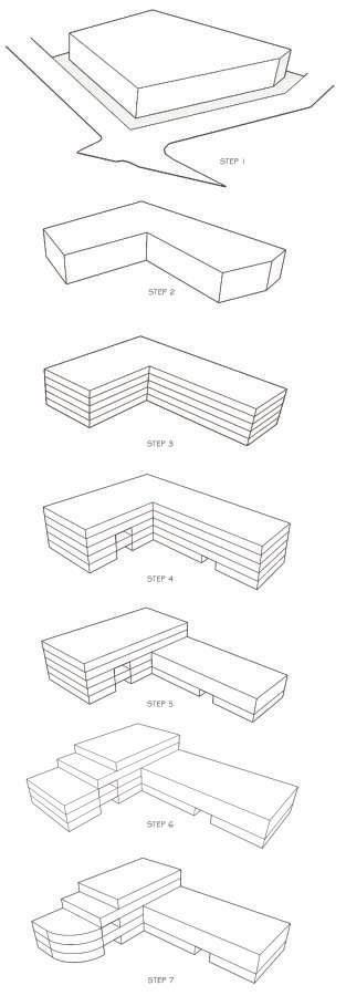 Explore the form of the building, considering the L-shaped footprint and the need to accommodate various functions. Optimize the layout to maximize natural light, views, and circulation efficiency. Consider creating a central atrium or void space to visually connect different levels and promote vertical integration.