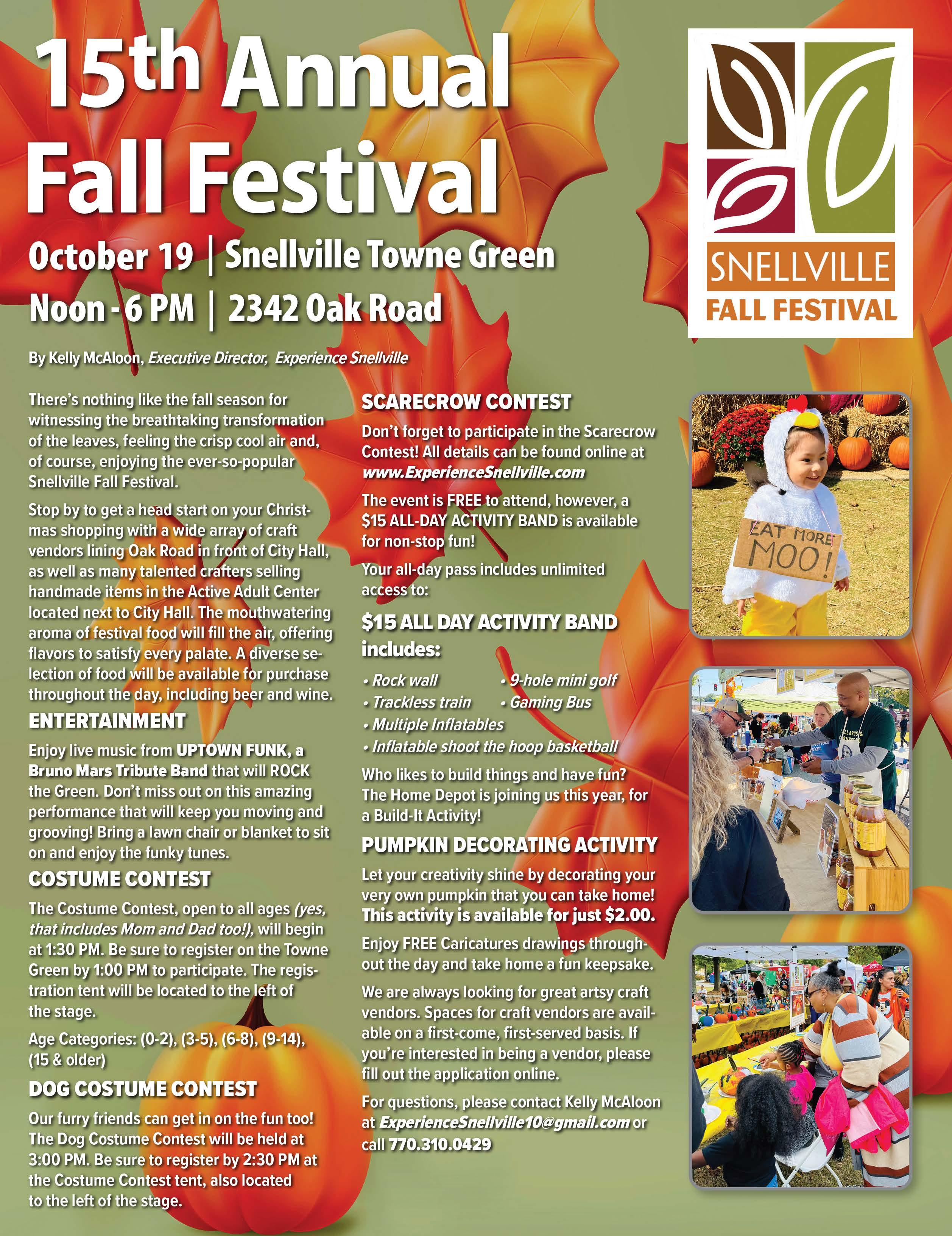 Experience Snellville has so much planned for the coming months. The International Taste of Snellville will be hosted in September, and we already have more than 25 restaurant vendors lined up for you to try cuisine from many of our local eateries. The Fall Festival is just around the corner in October. If you are interested in having a booth for our annual festival please contact us through the website.