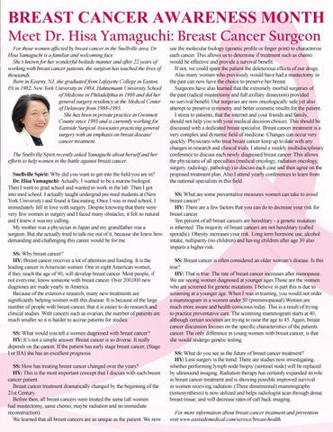 BREAST CANCER AWARENESS MONTH Meet Dr. Hisa Yamaguchi: Breast Cancer Surgeon For those women affected by breast cancer in the Snellville area, Dr. Hisa Yamaguchi is a familiar and welcoming face. She’s known for her wonderful bedside manner and after 22 years of working with breast cancer patients, the surgeon has touched the lives of thousands. Born in Kearny, NJ, she graduated from Lafayette College in Easton, PA in 1982, New York University in 1984, Hahnemann University School of Medicine in Philadelphia in 1988 and did her general surgery residency at the Medical Center of Delaware from 1988-1993. She has been in private practice in Gwinnett County since 1995 and is currently working for Eastside Surgical Associates practicing general surgery with an emphasis on breast disease/ cancer treatment. The Snellville Spirit recently asked Yamaguchi about herself and her efforts to help women in the battle against breast cancer. Snellville Spirit: Why did you want to get into the field you are in? Dr. Hisa Yamaguchi: Actually, I wanted to be a marine biologist. Then I went to grad school and wanted to work in the lab. Then I got into med school. I actually taught undergrad pre-med students at (New York University) and found it fascinating. Once I was in med school, I immediately fell in love with surgery. Despite knowing that there were very few women in surgery and I faced many obstacles, it felt so natural and I knew it was my calling. My mother was a physician in Japan and my grandfather was a surgeon. But she actually tried to talk me out of it, because she knew how demanding and challenging this career would be for me. SS: Why breast cancer? HY: Breast cancer receives a lot of attention and funding. It is the leading cancer in American women. One in eight American women, if they reach the age of 90, will develop breast cancer. Most people, if not everyone, know someone with breast cancer. Over 200,000 new diagnoses are made yearly in America. Because of the extensive research, many new treatments are significantly helping women with this disease. It is because of the large number of people with breast cancer, that it is easier to do research and clinical studies. With cancers such as ovarian, the number of patients are much smaller so it is harder to accrue patients for studies. SS: What would you tell a women diagnosed with breast cancer? HY: It’s not a simple answer. Breast cancer is so diverse. It really depends on the cancer. If the patient has early stage breast cancer, (Stage I or IIA) she has an excellent prognosis. SS: How has treating breast cancer changed over the years? HY: This is the most important concept that I discuss with each breast cancer patient. Breast cancer treatment dramatically changed by the beginning of the 21st Century. Before then, all breast cancers were treated the same (all women had mastectomy, same chemo, maybe radiation and no immediate reconstruction). We learned that all breast cancers are as unique as the patient. We now