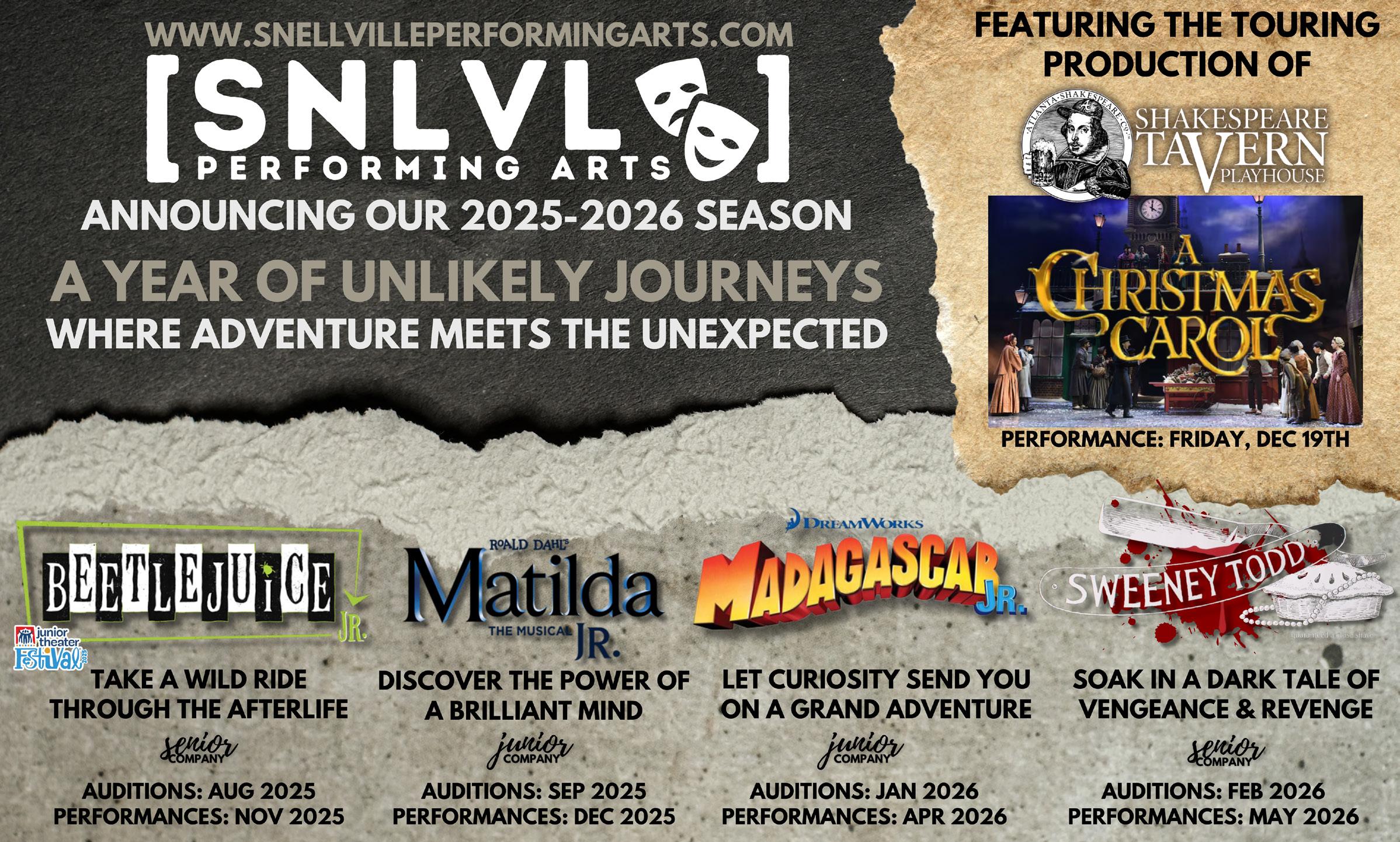 An exciting addition to their programming this year, SPA is thrilled to partner with The Atlanta Shakespeare Company to bring the touring cast of the Shakespeare Tavern’s A Christmas Carol to Snellville this holiday season! No need to travel all the way out to Midtown for this Christmas Classic when Scrooge, Marley, and the whole gang will perform for one night only right here on Friday, Dec. 19!