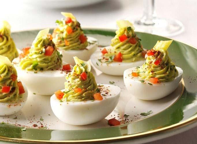 2. Cut a small hole in the tip of a pastry bag or in a corner of a foodsafe plastic bag; insert a medium star tip. Transfer avocado mixture to bag. Pipe into egg whites, swirling it upward to resemble Christmas trees. Sprinkle trees with minced red pepper, chili powder and remaining cilantro.