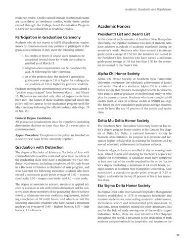 Delta Mu Delta Honor Society The Southern New Hampshire University business bachelor’s degree program honor society is the Gamma Nu chapter of Delta Mu Delta, a national honorary society in business administration. Its purpose is to promote and recognize higher scholarship in training for business and to reward scholastic achievement in business subjects. Students of good character enrolled in day or evening business- related majors and studying for bachelor’s degrees are eligible for membership. A candidate must have completed at least one half of the credits required for his or her bachelor’s degree (including a minimum of 24 credit hours, i.e., eight courses at Southern New Hampshire University), have maintained a cumulative grade point average of 3.25 or higher, and reside in the top 20 percent of his or her respective class.
