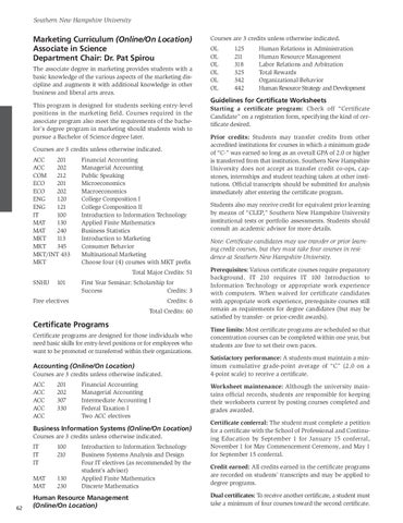 Guidelines for Certificate Worksheets Starting a certificate program: Check off “Certificate Candidate” on a registration form, specifying the kind of certificate desired. Prior credits: Students may transfer credits from other accredited institutions for courses in which a minimum grade of “C-” was earned so long as an overall GPA of 2.0 or higher is transferred from that institution. Southern New Hampshire University does not accept as transfer credit co-ops, capstones, internships and student teaching taken at other institutions. Official transcripts should be submitted for analysis immediately after entering the certificate program. Students also may receive credit for equivalent prior learning by means of “CLEP,” Southern New Hampshire University institutional tests or portfolio assessments. Students should consult an academic advisor for more details. Note: Certificate candidates may use transfer or prior learning credit courses, but they must take four courses in residence at Southern New Hampshire University. Prerequisites: Various certificate courses require preparatory background. IT 210 requires IT 100 Introduction to Information Technology or appropriate work experience with computers. When waived for certificate candidates with appropriate work experience, prerequisite courses still remain as requirements for degree candidates (but may be satisfied by transfer- or prior-credit awards). Time limits: Most certificate programs are scheduled so that concentration courses can be completed within one year, but students are free to set their own paces. Satisfactory performance: A students must maintain a minimum cumulative grade-point average of “C” (2.0 on a 4-point scale) to receive a certificate. Worksheet maintenance: Although the university maintains official records, students are responsible for keeping their worksheets current by posting courses completed and grades awarded. Certificate conferral: The student must complete a petition for a certificate with the School of Professional and Continuing Education by September 1 for January 15 conferral, November 1 for May Commencement Ceremony, and May 1 for September 15 conferral. Credit earned: All credits earned in the certificate programs are recorded on students’ transcripts and may be applied to degree programs. Dual certificates: To receive another certificate, a student must take a minimum of four courses toward the second certificate.