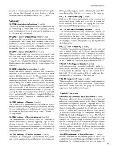 Sociology SOC 112 Introduction to Sociology (3 credits) This course studies the organization of social behavior and its relationship to society and social conditions. Culture, norm stratification, systems, structure, social institutions and social change are emphasized. SOC 213 Sociology of Social Problems (3 credits) Students in this course analyze contemporary social problems in America and other societies. Issues include economic limitations, class and poverty, race and ethnic relations, sexism, ageism, and environmental and population concerns. Prerequisite: SOC 112 or permission of the instructor. SOC 317 Sociology of the Family (3 credits) This course is a sociological examination of the family institution in America and other societies. Traditional and nontraditional family patterns are studied to provide students with a structure for understanding sex, marriage, family and kinship systems. Prerequisite: SOC 112 or permission of the instructor. SOC 318 Sustainable Communities (3 credits) How do we build a society fit for living? This course looks to the field of environmentally sustainable community development (ESCD) for answers to this question. Students explore the principles and practices of ESCD using patternmapping of community needs, site visits, and other experiential learning tools that turn communities into classrooms, and bring the challenge of building environmentally sustainable communities to life. In the process, students identify assumptions that lead to unsustainable social practices, and develop the skills necessary to help create livable local landscapes and sustainable local futures through individual and community action. This course is cross-listed as ENV 318. Prerequisite: SOC 112. SOC 320 Sociology of Gender (3 credits) The examination of gender in society. Students will explore the social construction of gender, gender identity development, sexuality and power, and other aspects concerning the meanings and implications of being “male,” “female,” or “transgendered.” SOC 324 Sociology of Crime & Violence (3 credits) The course examines the nature, causes, and consequences of crime and violence to a society. Applying a legal and sociological perspective, the course examines: 1. the structure of the law and the criminal justice system; 2. the nature and causation of criminal behavior; and 3. the various types of crime and criminality. SOC 326 Sociology of Deviant Behavior (3 credits) This course is a sociological analysis of the nature, causes and societal reactions to deviant behavior, including mental