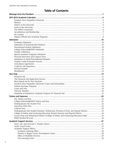 Table of Contents Message from the President . . . . . . . . . . . . . . . . . . . . . . . . . . . . . . . . . . . . . . . . . . . . . . . . . . . . . . . . . . . . . . . . . . .1 2011-2012 Academic Calendars . . . . . . . . . . . . . . . . . . . . . . . . . . . . . . . . . . . . . . . . . . . . . . . . . . . . . . . . . . . . . . . . .4 Southern New Hampshire University . . . . . . . . . . . . . . . . . . . . . . . . . . . . . . . . . . . . . . . . . . . . . . . . . . . . .5 Mission . . . . . . . . . . . . . . . . . . . . . . . . . . . . . . . . . . . . . . . . . . . . . . . . . . . . . . . . . . . . . . . . . . . . . . . . . . .5 History of the University . . . . . . . . . . . . . . . . . . . . . . . . . . . . . . . . . . . . . . . . . . . . . . . . . . . . . . . . . . . . . .5 Goals of the University . . . . . . . . . . . . . . . . . . . . . . . . . . . . . . . . . . . . . . . . . . . . . . . . . . . . . . . . . . . . . . . .6 The SNHU Community . . . . . . . . . . . . . . . . . . . . . . . . . . . . . . . . . . . . . . . . . . . . . . . . . . . . . . . . . . . . . . .6 Accreditation and Membership . . . . . . . . . . . . . . . . . . . . . . . . . . . . . . . . . . . . . . . . . . . . . . . . . . . . . . . . . .7 On Campus . . . . . . . . . . . . . . . . . . . . . . . . . . . . . . . . . . . . . . . . . . . . . . . . . . . . . . . . . . . . . . . . . . . . . . . .7 Degrees Offered and Academic Programs . . . . . . . . . . . . . . . . . . . . . . . . . . . . . . . . . . . . . . . . . . . . . . . . . .8 Admission . . . . . . . . . . . . . . . . . . . . . . . . . . . . . . . . . . . . . . . . . . . . . . . . . . . . . . . . . . . . . . . . . . . . . . . . . . . . . . . . .10 Freshman Admission . . . . . . . . . . . . . . . . . . . . . . . . . . . . . . . . . . . . . . . . . . . . . . . . . . . . . . . . . . . . . . . .10 Admission of Homeschooled Students . . . . . . . . . . . . . . . . . . . . . . . . . . . . . . . . . . . . . . . . . . . . . . . . . . . .10 International Student Admission . . . . . . . . . . . . . . . . . . . . . . . . . . . . . . . . . . . . . . . . . . . . . . . . . . . . . . . .10 College Unbound@SNHU Admission . . . . . . . . . . . . . . . . . . . . . . . . . . . . . . . . . . . . . . . . . . . . . . . . . . . .10 Transfer Admission . . . . . . . . . . . . . . . . . . . . . . . . . . . . . . . . . . . . . . . . . . . . . . . . . . . . . . . . . . . . . . . . . .11 Special Academic Programs Admission . . . . . . . . . . . . . . . . . . . . . . . . . . . . . . . . . . . . . . . . . . . . . . . . . . .11 Personal Interviews and Campus Tours . . . . . . . . . . . . . . . . . . . . . . . . . . . . . . . . . . . . . . . . . . . . . . . . . . .12 Admission of Adult/Nontraditional Students . . . . . . . . . . . . . . . . . . . . . . . . . . . . . . . . . . . . . . . . . . . . . . .12 Transfer Credit Evaluation Process . . . . . . . . . . . . . . . . . . . . . . . . . . . . . . . . . . . . . . . . . . . . . . . . . . . . . .12 Articulation Agreements . . . . . . . . . . . . . . . . . . . . . . . . . . . . . . . . . . . . . . . . . . . . . . . . . . . . . . . . . . . . . .12 Credit for Life Experience . . . . . . . . . . . . . . . . . . . . . . . . . . . . . . . . . . . . . . . . . . . . . . . . . . . . . . . . . . . . .13 Internal Transfer . . . . . . . . . . . . . . . . . . . . . . . . . . . . . . . . . . . . . . . . . . . . . . . . . . . . . . . . . . . . . . . . . . .13 Readmission . . . . . . . . . . . . . . . . . . . . . . . . . . . . . . . . . . . . . . . . . . . . . . . . . . . . . . . . . . . . . . . . . . . . . .13 One Stop . . . . . . . . . . . . . . . . . . . . . . . . . . . . . . . . . . . . . . . . . . . . . . . . . . . . . . . . . . . . . . . . . . . . . . . . . . . . . . . . . .13 Financial Aid . . . . . . . . . . . . . . . . . . . . . . . . . . . . . . . . . . . . . . . . . . . . . . . . . . . . . . . . . . . . . . . . . . . . . .13 The Financial Aid Application Process . . . . . . . . . . . . . . . . . . . . . . . . . . . . . . . . . . . . . . . . . . . . . . . . . . .14 Merit Based Aid for New Students . . . . . . . . . . . . . . . . . . . . . . . . . . . . . . . . . . . . . . . . . . . . . . . . . . . . . .14 Southern New Hampshire University Grants and Scholarships . . . . . . . . . . . . . . . . . . . . . . . . . . . . . . . . . .15 Federal and State Programs . . . . . . . . . . . . . . . . . . . . . . . . . . . . . . . . . . . . . . . . . . . . . . . . . . . . . . . . . . .18 Loans and Jobs . . . . . . . . . . . . . . . . . . . . . . . . . . . . . . . . . . . . . . . . . . . . . . . . . . . . . . . . . . . . . . . . . . . .19 Veterans’ Benefits . . . . . . . . . . . . . . . . . . . . . . . . . . . . . . . . . . . . . . . . . . . . . . . . . . . . . . . . . . . . . . . . . . .20 Standards of Satisfactory Academic Progress for Financial Aid . . . . . . . . . . . . . . . . . . . . . . . . . . . . . . . . . .21 Tuition and Expenses . . . . . . . . . . . . . . . . . . . . . . . . . . . . . . . . . . . . . . . . . . . . . . . . . . . . . . . . . . . . . . . . . . . . . . . .22 ESL Tuition and Fees . . . . . . . . . . . . . . . . . . . . . . . . . . . . . . . . . . . . . . . . . . . . . . . . . . . . . . . . . . . . . . . .22 College Unbound@SNHU Tuition and Fees . . . . . . . . . . . . . . . . . . . . . . . . . . . . . . . . . . . . . . . . . . . . . . . .22 Undergraduate Day Student Fees . . . . . . . . . . . . . . . . . . . . . . . . . . . . . . . . . . . . . . . . . . . . . . . . . . . . . . .22 University Wide Fees . . . . . . . . . . . . . . . . . . . . . . . . . . . . . . . . . . . . . . . . . . . . . . . . . . . . . . . . . . . . . . . .23 Culinary Fees . . . . . . . . . . . . . . . . . . . . . . . . . . . . . . . . . . . . . . . . . . . . . . . . . . . . . . . . . . . . . . . . . . . . . .23 Undergraduate Day Student Payment, Withdrawal, Proration of Fees, and Deposit Policies . . . . . . . . . . . . .23 College of Online and Continuing Education S