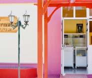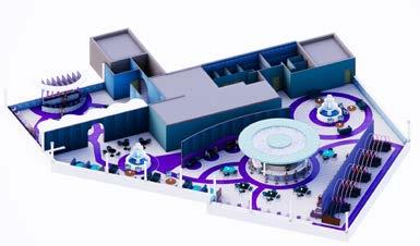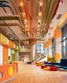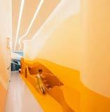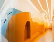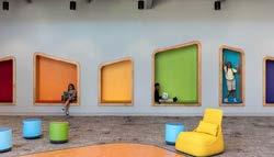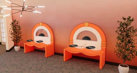 Bright colors and curved design elements are used to create a lively atmosphere for relaxation. Lockers offer secure storage for belongings, promoting peace of mind and convenience.