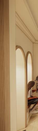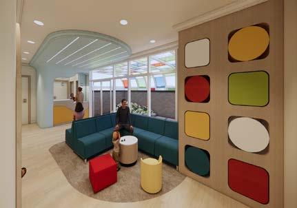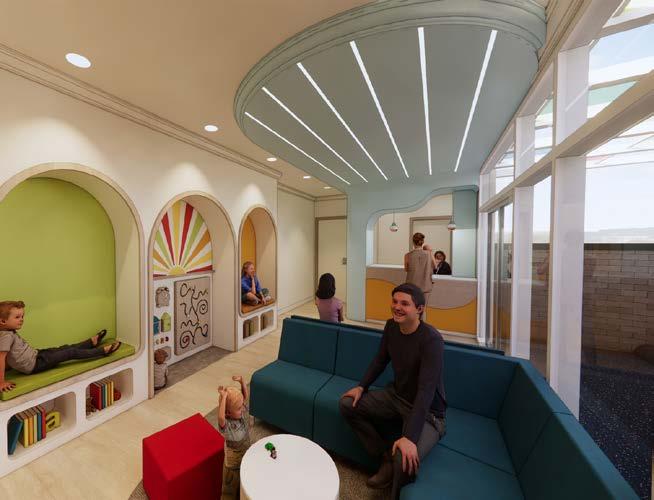 The reception area offers diverse seating choices and a sensory wall to engage children positively, with careful consideration for clear sightlines for parental supervision, ensuring a comfortable and secure family environment.
