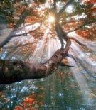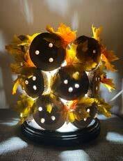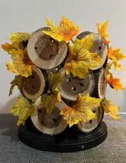 The Fall Lantern Lamp is designed with nature in mind, using wooden circles and fall-colored leaves to mimic sunlight peeking through the trees.