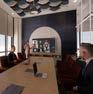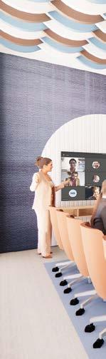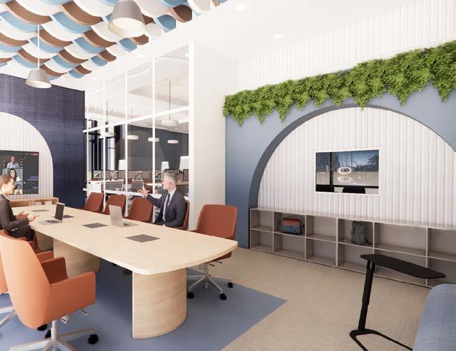 In the client presentation room, a monitor facilitates seamless connectivity for both in-office and remote employees, complemented by custom acoustic ceiling panels for enhanced sound quality and personal storage cubbies to accommodate individual belongings.
