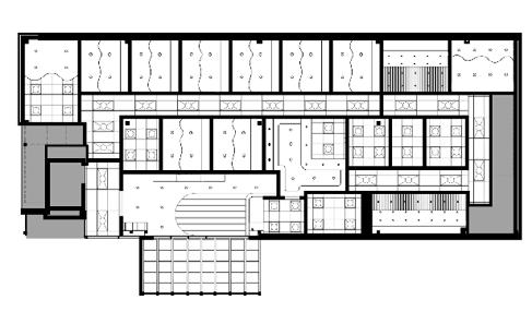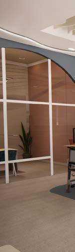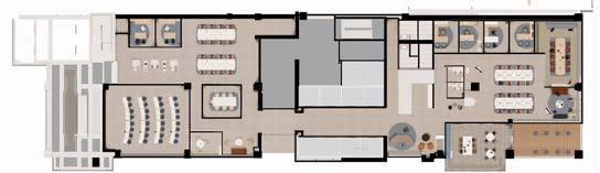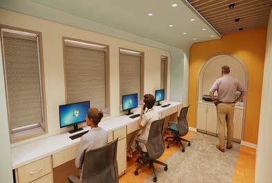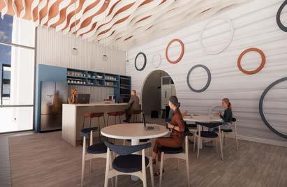 The breakroom features custom ceiling panels designed to absorb and reduce noise, creating a peaceful environment. Large windows allow natural light to filter in, promoting a positive atmosphere that enhances mood and productivity.