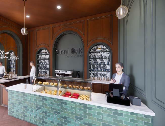Situated in the lobby, draws inspiration from the legendary Bigfoot creature. The cafe features a forest green color scheme with light neutral accents, creating a grounding atmosphere.