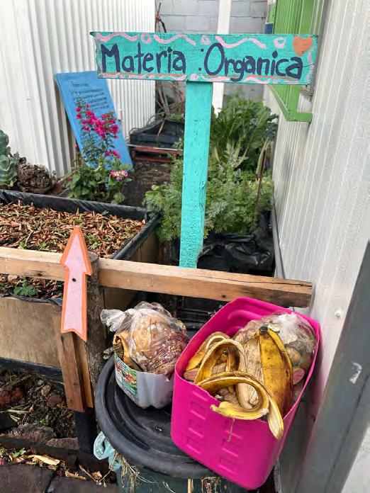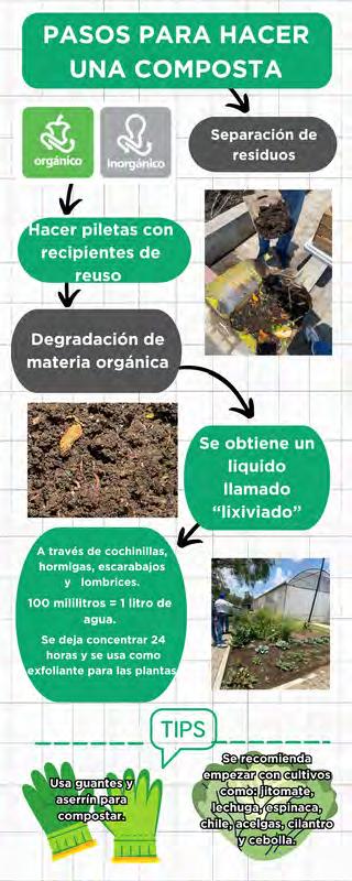 Para la realización de composta se trabaja desde la separación de los residuos orgánicos: poda del pasto y comida. El proceso de compostaje consiste en la utilización de recipientes como cubetas, tinas y huacales, con pequeñosorificios,asícomo“camas”que son una especie de piletas con un ligero gradodeinclinaciónenlaquesedeposita en capas; tierra de macetas que no se ocupe, materia verde; poda del pasto, árboles, plantas u hojarasca, materia orgánica; cáscaras de fruta, residuos de verduras,cascaronesdehuevo,sobresde téylosfiltrosconcafé.