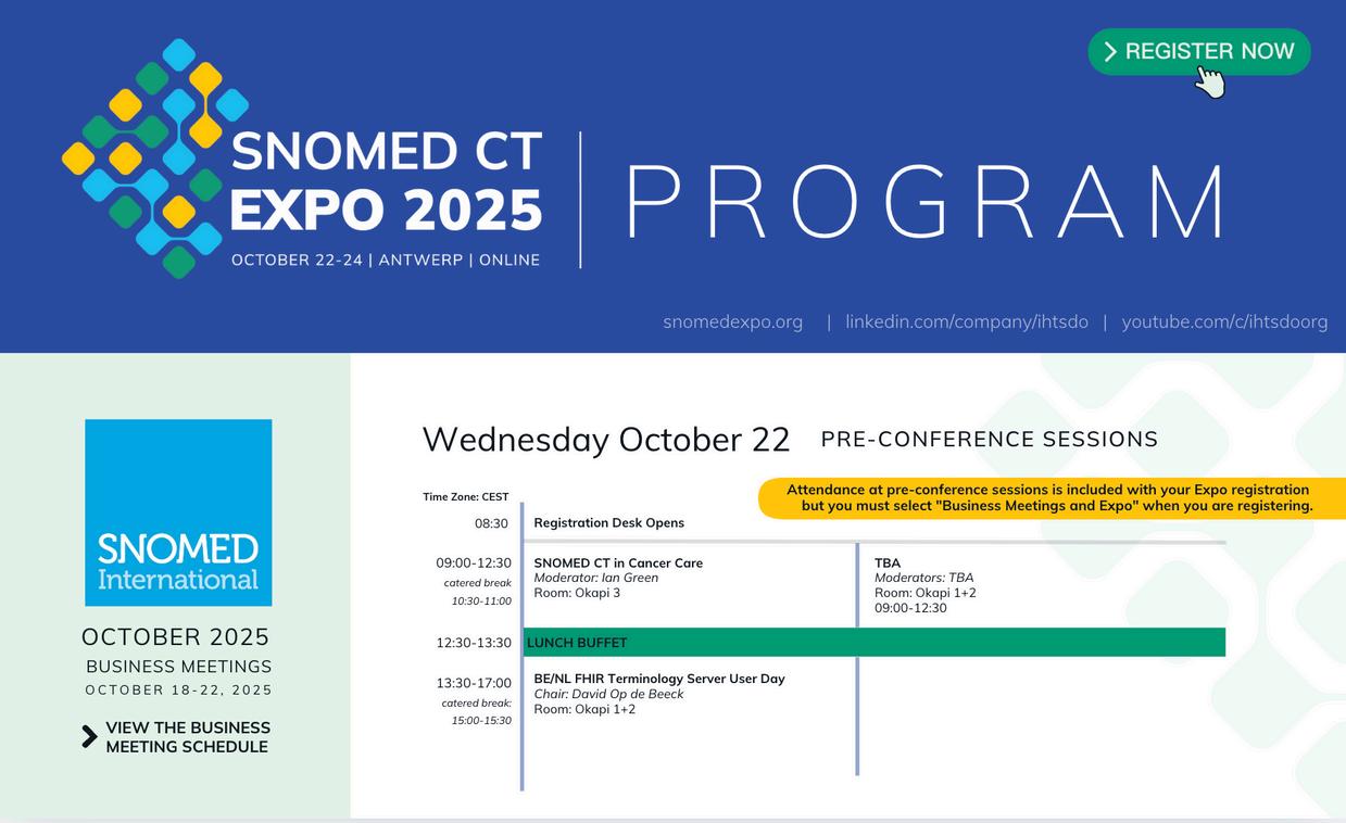 12:55 202519 Surgical procedure translation: Enabling national use and supporting EHDS readiness - Frank Geier (DE) 13:05 202518 A unified framework for SNOMED CT terminology bindings in pathology: Enhancing EHDS secondary use through standardized oncology and non-oncology