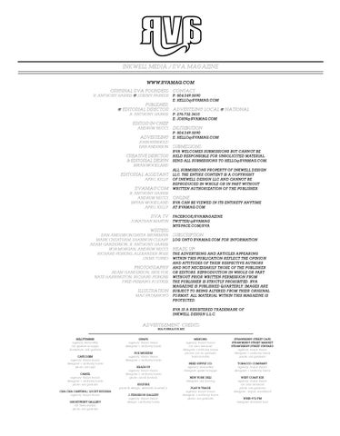 CONTACT P: 804.349.5890 E: HELLO@RVAMAG.COM ADVERTISING LOCAL & NATIONAL P: 276.732.3410 E: JOHN@RVAMAG.COM DISTRIBUTION P: 804.349.5890 E: HELLO@RVAMAG.COM SUBMISSIONS RVA WELCOMES SUBMISSIONS BUT CANNOT BE HELD RESPONSIBLE FOR UNSOLICITED MATERIAL. SEND ALL SUBMISSIONS TO HELLO@RVAMAG.COM. ALL SUBMISSIONS PROPERTY OF INKWELL DESIGN LLC. THE ENTIRE CONTENT IS A COPYRIGHT OF INKWELL DESIGN LLC AND CANNOT BE REPRODUCED IN WHOLE OR IN PART WITHOUT WRITTEN AUTHORIZATION OF THE PUBLISHER. ONLINE RVA CAN BE VIEWED IN ITS ENTIRETY ANYTIME AT RVAMAG.COM FACEBOOK/RVAMAGAZINE TWITTER/@RVAMAG MYSPACE.COM/RVA SUBSCRIPTION LOG ONTO RVAMAG.COM FOR INFORMATION HEADS UP! THE ADVERTISING AND ARTICLES APPEARING WITHIN THIS PUBLICATION REFLECT THE OPINION AND ATTITUDES OF THEIR RESPECTIVE AUTHORS AND NOT NECESSARILY THOSE OF THE PUBLISHER OR EDITORS. REPRODUCTION IN WHOLE OR PART WITHOUT PRIOR WRITTEN PERMISSION FROM THE PUBLISHER IS STRICTLY PROHIBITED. RVA MAGAZINE IS PUBLISHED QUARTERLY. IMAGES ARE SUBJECT TO BEING ALTERED FROM THEIR ORIGINAL FORMAT. ALL MATERIAL WITHIN THIS MAGAZINE IS PROTECTED. RVA IS A REGISTERED TRADEMARK OF INKWELL DESIGN L.L.C.
