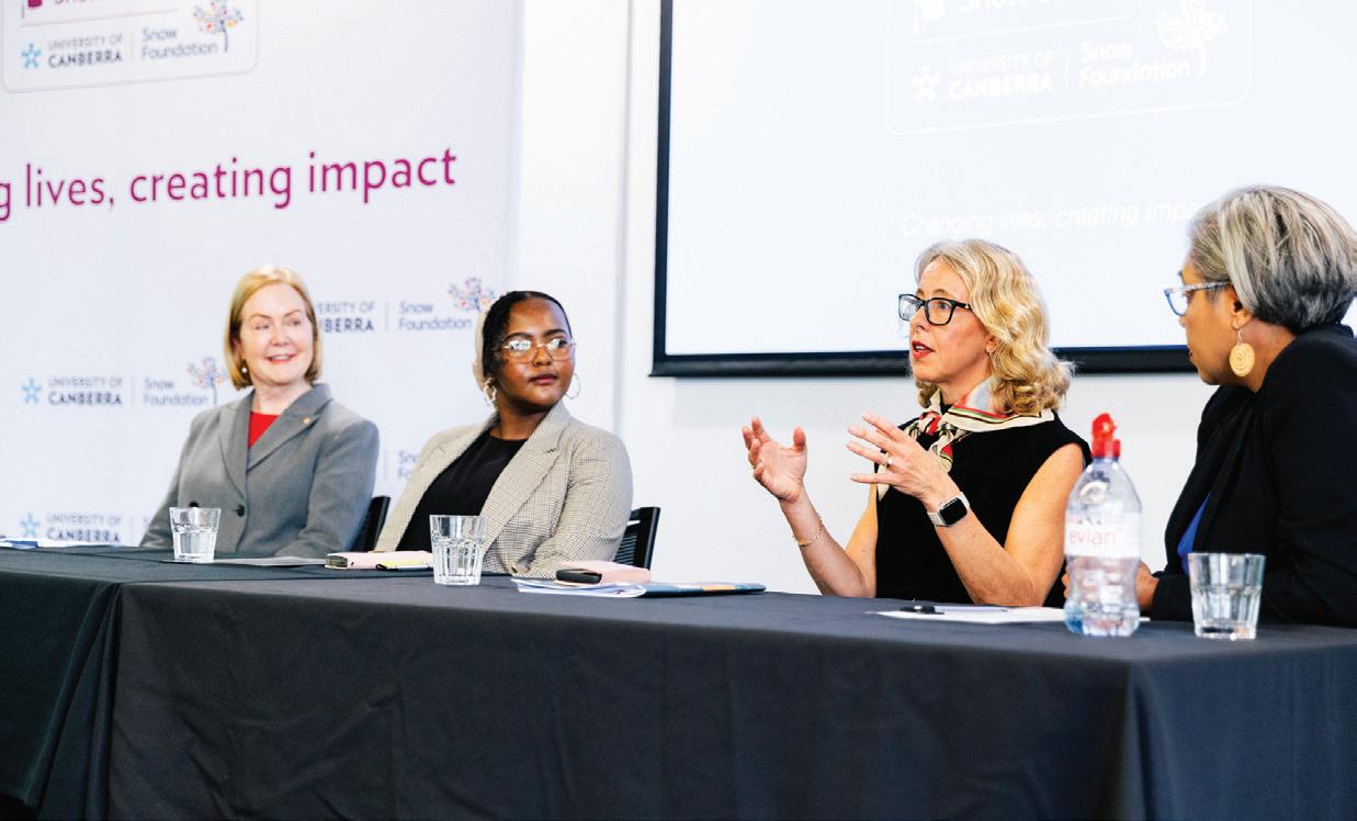 Georgina Byron and Vicki Wade - Aboriginal Cultural Lead – Deadly Heart Trek education session on healthy hearts and skin. Snow Foundation Sydney team volunteer day at Snow Entrepreneurs ReLove. Vincent Fairfax Family Foundation and Snow Foundation on the NSW South Coast with FRRR. Lisa Paul, Mushtaha Ahmed, Georgina Byron, Maree Meredith at the Snow Scholarships launch with University of Canberra. Carolyn Ludovici and Scarlett Gaffey at the Snow Foundation team cultural awareness day. Snow Entrepreneurs celebrate at their annual retreat. Megan Parsons with Australian Business Community Network Accelerate Program scholars. Speakers at the Sydney Women's Fund International Women’s Day breakfast event at Philanthropy Australia: Jack Heath - former CEO Philanthropy Australia, Candice Van Doosselaere- Judith Neilson Foundation, Angelica Ojinnakaglobal youth affairs leader, Georgina Byron, Karen Iles - VioletCo Legal & Consulting, Lisa Grinham - Sydney Women's Fund. Terry and Georgina.