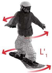 •Utiliser le moment de force opposé (angulation): l’angulation du haut du corps déclenche un moment de force M’1. Par le principe d’action et de réaction, le bas du corps subit un moment de force opposé –M’1 de même grandeur.