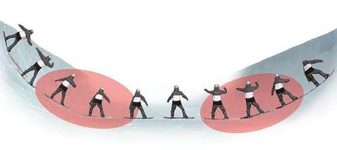 Une extension dynamique permet de gagner de la vitesse, àl’image d’une accélération en sortie de courbe. Le CGC se rapproche de l’axe de rotation grâce àune extension dynamique (d’où une réduction du moment d’inertie). Le moment cinétique se transforme alors en vitesse (conservation du moment cinétique). La zone où le changement de direction est le plus marqué en raison de la courbureduhalfpipe (située verticalement sous le centreimaginairedes cercles), se prête idéalement àcette action. La force d’inertie et la pesanteur freinent àcemoment-là.