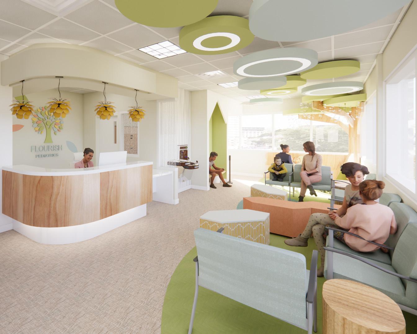 This clinic incorporates color theory to emotionally and conceptually connect with its users. Soft blues and greens are used to establish a calming, soothing atmosphere that fosters healing, while brighter hues like yellow, orange, and pink add a playful touch to appeal to children. Tree motifs and nature-inspired elements are woven throughout the space, creating a comforting and familiar environment that not only helps children feel at ease, but also inspires them to spend more time in nature. The color palette reflects the vibrant seasonal changes of flourishing trees, reinforcing this connection to nature. Through these intentional design strategies, the clinic creates a nurturing space where children can flourish in every season of life.
