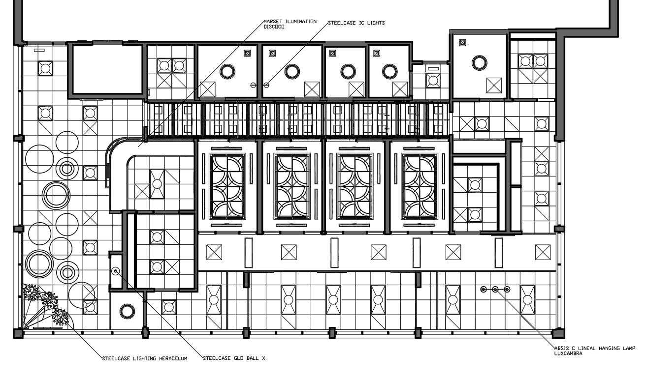 • The soffit mirrors the shape of the reception desk, establishing a vertical relationship between the two elements.
