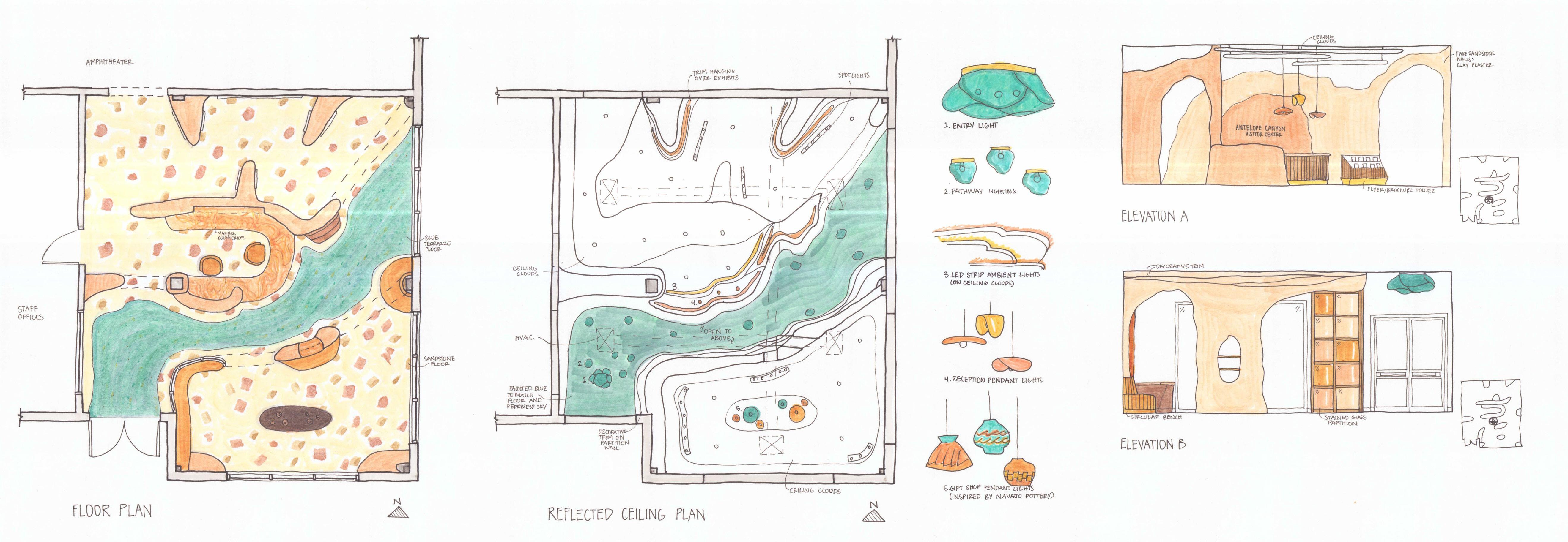 The client owns a plot of land near Antelope Canyon and plans to build a new visitor center that reflects the surrounding environment through thoughtful and creative design. The center should include three main spaces: a reception desk, a gift shop, and an exhibit space.