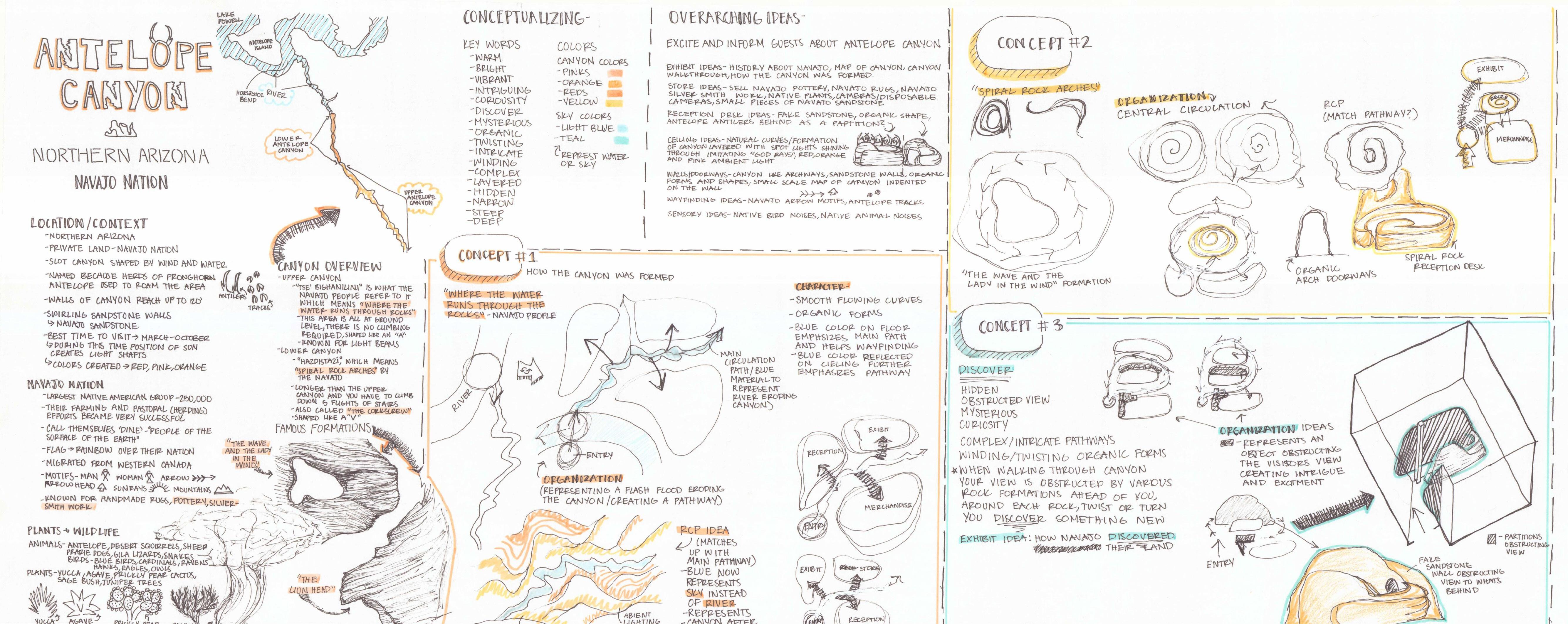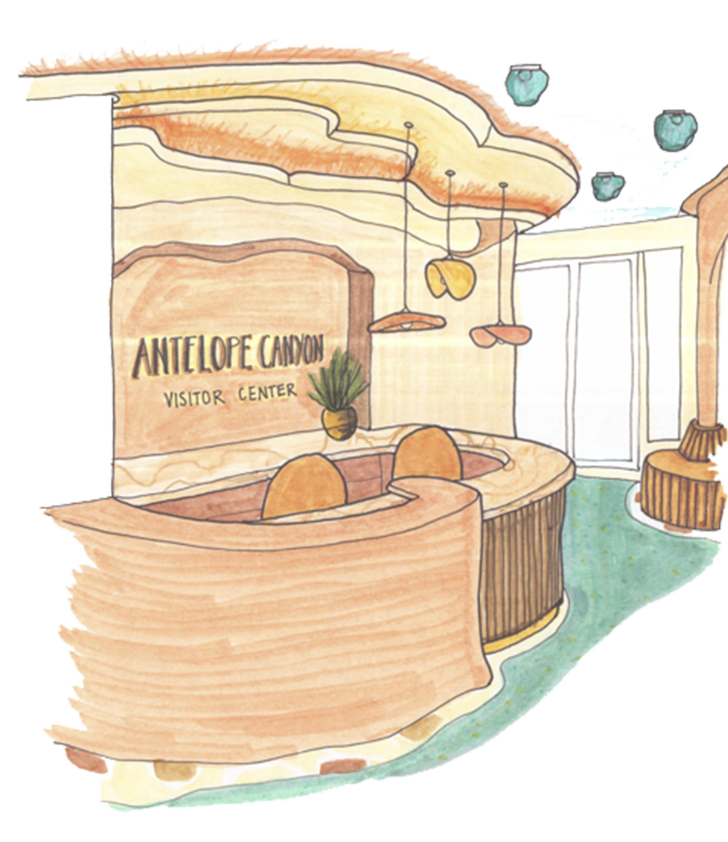 The client owns a plot of land near Antelope Canyon and plans to build a new visitor center that reflects the surrounding environment through thoughtful and creative design. The center should include three main spaces: a reception desk, a gift shop, and an exhibit space.