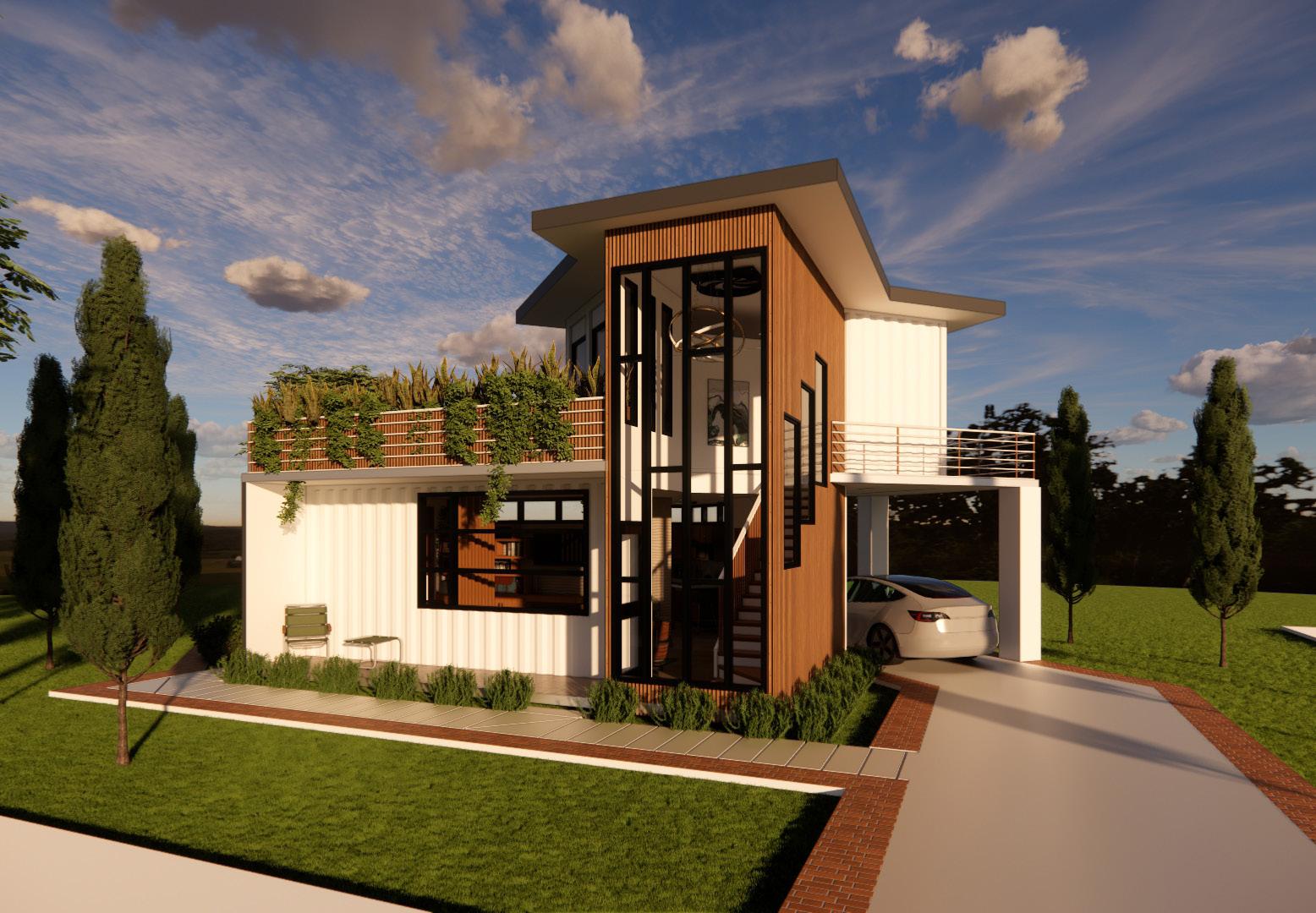 The K Residence is a project that involves designing a sustainable, energy-efficient twostory residence using only 3 recycled shipping containers for a mid-40s male professor who recently moved to the Kansas City area. He loves mid-century modern and natural colors. The design process focuses on creative thinking, efficient problem-solving, and understanding client expectations.