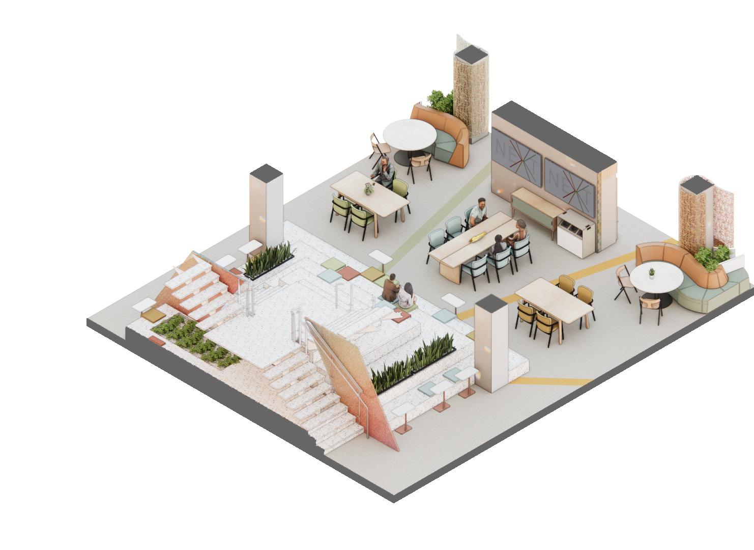 Different colors of light symbolize diverse perspectives, reflecting NEXT’s vision of collaboration and shared purpose. Through biocentric lighting and light therapy pods, the workplace fosters well-being, enhancing mood, creativity, and productivity for a healthier, more cohesive environment.