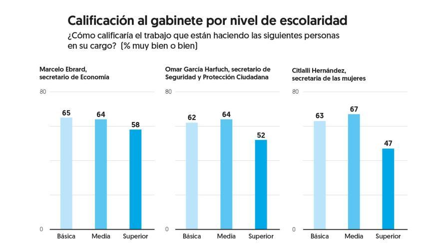 De acuerdo con el sondeo, las evaluaciones al gabinete varían según el nivel de escolaridad, siendo las personas entrevistadas con nivel básico o medio las que les evalúan más favorablemente cinco de los siete secretarios evaluados, y las que tienen estudios universitarios las que les evalúan menos favorablemente.