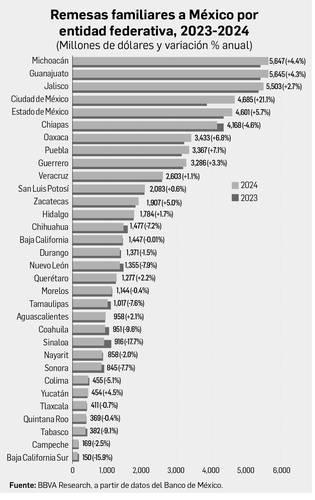 Destacó que Michoacán retomó el primer lugar en recepción de remesas con un ingreso anual de 5 mil 647 millones de dólares, seguido de Guanajuato con 5 mil 643 millones, y Jalisco, con 5 mil 503 millones. A estas tres entidades llegaron uno de cada cuatro pesos de las remesas en 2024, precisó.